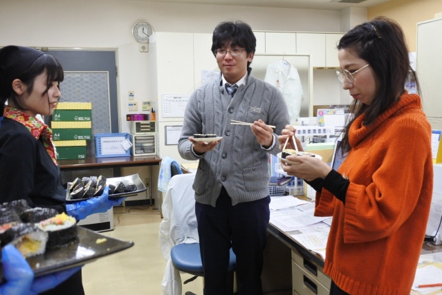 イベント 2020/02/19 宗汰くん 新入社員フォローアップ研修 内定者のフォローアップ研修として、巻寿司製造体験を行いました。 生産部I課長の優しく丁寧なご指導の元、皆さん、一生懸命巻寿司を 巻いていました。最後には各自がオリジナルの巻寿司を作り、従業員の 皆さんにふるまって下さいました。美味しく出来ていましたよ!